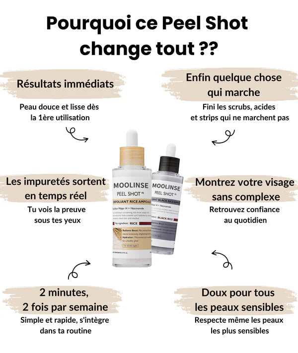 " J'ai essayé le Peel Shot et c'est super facile à utiliser, ma peau est si douce après. J'avais un peu peur que ce soit trop agressif, mais ça n'a pas piqué et mon visage n'est pas devenu rouge."